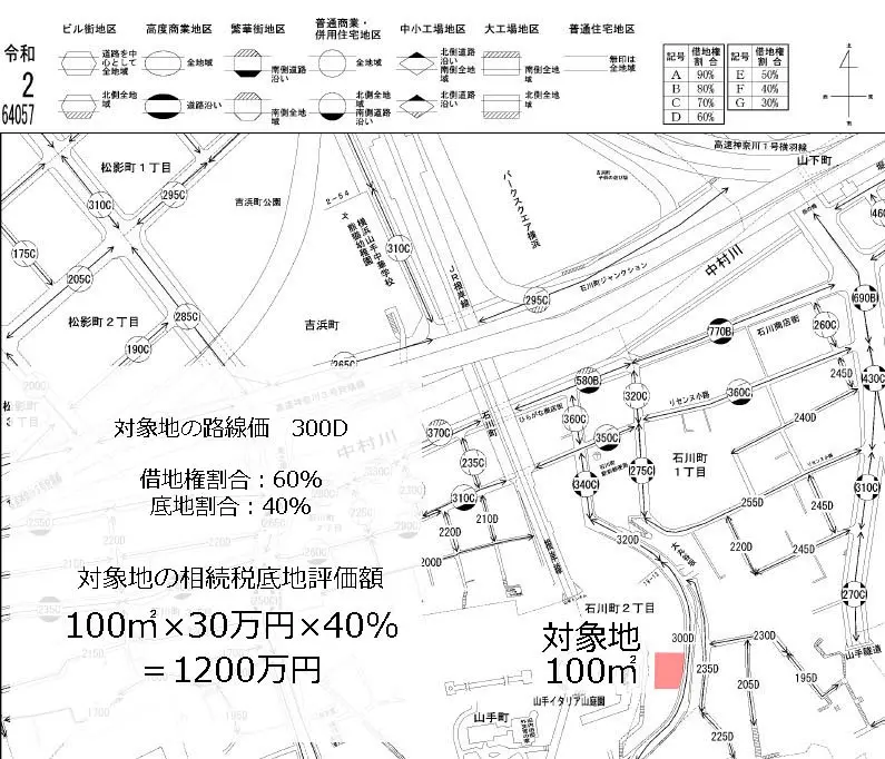 この数字が路線価であり、アルファベットは借地権割合を示しています。