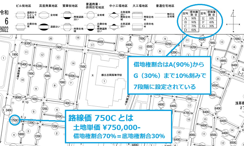 ⇒例えば「750C」とあったら「地価75万円/㎡、借地権割合70%」という意味です。